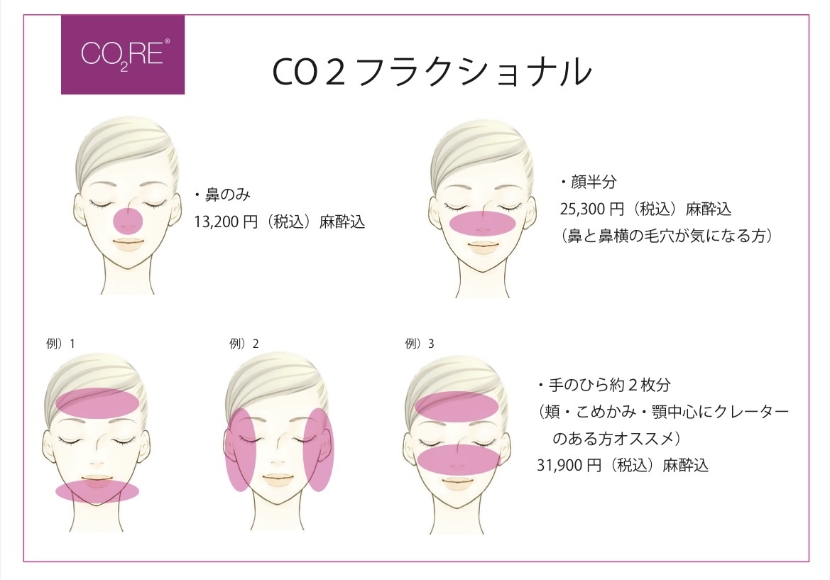 | ダウンタイム 副作用 | CO2フラクショナルを照射した直後は、肌に傷がついて炎症が起こります。炎症中の肌は、外部からの攻撃に対して防御力が低下します。そのためダウンタイム中は摩擦や紫外線などのダメージを受けると、余計に炎症が酷くなりやすいです。一時的な色素沈着、肝斑の悪化する場合や、やけどや水ぶくれを起こす可能性があります。 |