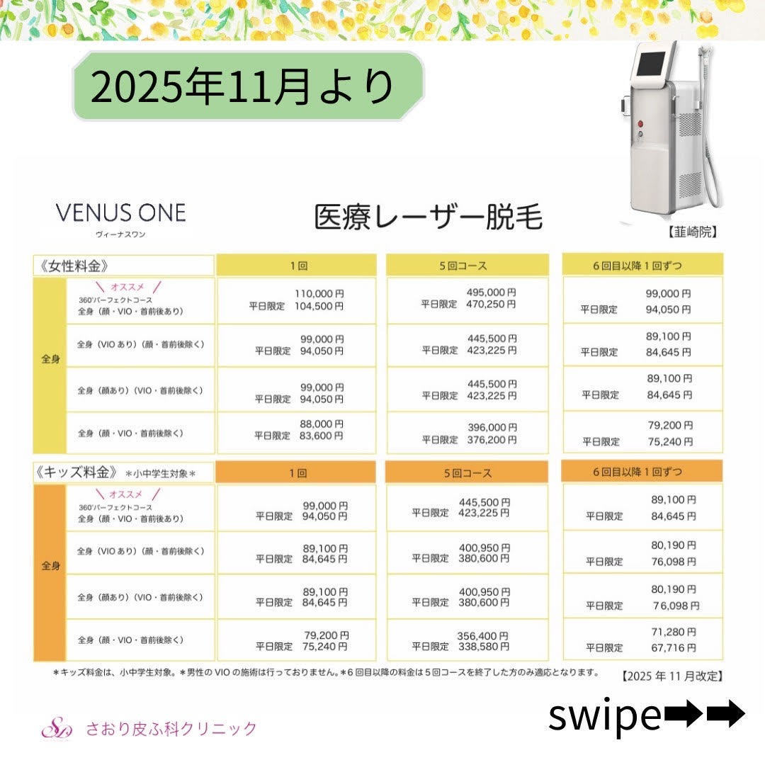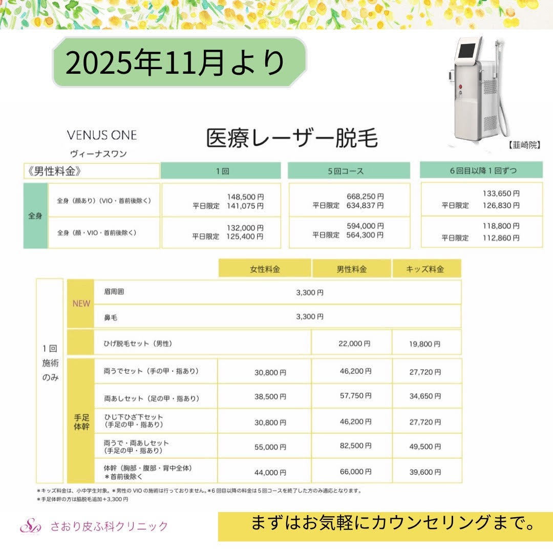 11月よりヴィーナス脱毛の1部の料金改定となります。
